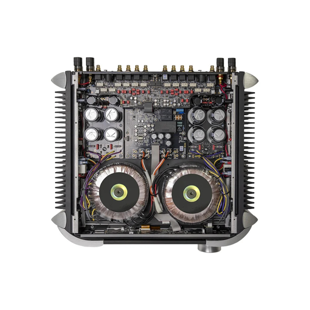 Загляните внутрь, и вы обнаружите, что аккуратно спланированная схема организована в виде симметричной схемы двойного моно, где цепи левого и правого каналов полностью разделены, что позволяет иметь собственный источник питания со специальным тороидальным трансформатором. Это в некоторой степени объясняет немалый вес усилителя — 26 кг.