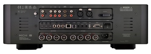 Интегральный усилитель Michi X3 Series 2 оснащен полным набором современных функций и способен удовлетворить запросы самых требовательных меломанов. Модель изготовлена в массивном корпусе, надежно защищающем ее схемы от любых нежелательных внешних воздействий. Фронтальная панель Michi X3 Series 2 имеет лаконичное оформление: на ней находятся всего две рукоятки и дисплей. Доступ ко всем функциям аппарата организован через меню, что делает его использование очень удобным. Michi X3 Series 2 оснащен усилителями мощности, работающими в классе A/B и развивающими до 350 Вт на канал. Они собраны на отдельных платах, расположенных по обеим сторонам корпуса усилителя непосредственно на радиаторах охлаждения. Подобная мощность может показаться избыточной для усилителя, предназначенного для домашнего прослушивания музыки. Однако она обеспечивает точную передачу динамических нюансов композиций и делает звучание живым и плавным. В блоке питания Michi X3 Series 2 задействован мощный тороидальный трансформатор с раздельными обмотками для каналов усиления мощности и остальных схем. Michi X3 Series 2 имеет встроенный фонокорректор, рассчитанный на подключение MM- и MC-звукоснимателей. Также в наличии три линейных входа на разъемах RCA и один балансный XLR. В аппарате предусмотрены три коаксиальных, три оптических и USB-входы. ЦАП в усилителе построен на базе современной 8-канальной микросхемы ES9028PRO, сконфигурированной для работы в 2-канальном режиме. Это обеспечило очень низкий уровень шумов и точную передачу мельчайших нюансов музыкальных записей. Через USB-подключение поддерживается воспроизведение PCM с параметрами до 32 бит / 384 кГц, DSD 11,2 МГц. Есть возможность декодирования MQA с параметрами до 24 бит / 384 кГц. Настройка характера звучания усилителя возможна с помощью регулятора тембра по низким и высоким частотам. Для беспроводного подключения мобильных устройств в Michi X3 Series 2 предусмотрен Bluetooth с поддержкой aptX HD. Внешнее управление усилителем может быть реализовано через интерфейсы Ethernet или RS-232.