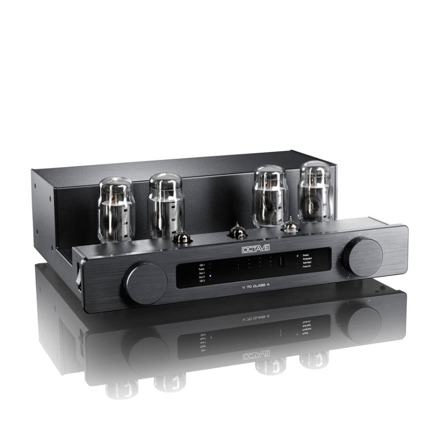 Интегральный ламповый усилитель Octave V 70 Class A построен по двухтактной схеме и работает в классе А. Аппарат имеет привлекательный минималистский дизайн и качественную отделку, характерную для моделей премиум-класса. Данная модель выпускается в черном или серебристом вариантах. Octave V 70 Class A оснащен пятью линейными входами на разъемах RCA, одним балансным входом, а также линейным и регулируемыми выходами. Кроме того, в усилителе имеется вход Bypass, с помощью которого аппарат можно использовать в многоканальной системе домашнего кинотеатра. Octave V 70 Class A оснащен платой MM/MC-фонокорректора. Оригинальная схема усилителя была разработана инженерами компании и в ней используется динамическое управление смещением ламп выходного каскада. Это позволило создать саморегулирующийся усилитель класса A с выходной мощностью, значительно превышающий этот показатель у классических моделей. Фактически, Octave V 70 Class A обладает всеми преимуществами усилителей класса A с точки зрения плавности и музыкальности звука, с эффективностью двухтактных схем в классе A/B. В усилителе Octave V 70 Class A используется схема с автоматическим смещением, то есть дополнительная подстройка параметров схемы под конкретную используемую лампу не требуется. Светодиодные индикаторы позволят визуально контролировать корректность установленных режимов. Как и другие высококлассные усилители компании Octave, V 70 Class A выпускается в вариантах Power High - выходные лампы KT 120 (стандартная заводская комплектация) либо KT 150 (по предзаказу или приобретаются отдельно), - и Low, на лампах KT88 или 6550. Специальная схема в источнике питания защищает усилитель от различных сетевых помех, которые могут снизить качество его звучания. Аппарат обладает напористым и динамичным звуком с первоклассной детализацией, а также сбалансированным и очень натуральным среднечастотным диапазоном. В отличие от других ламповых усилителей в классе А, Octave V 70 Class A отлично работает с самой различной акустикой, в том числе и обладающей средними показателями чувствительности.