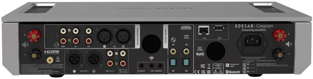 Roksan Caspian 4G Streaming Amplifier отражает передовой дизайнерский стиль Roksan, впервые представленный в серии Attessa. Современный внешний вид включает в себя четкие линии, скошенные кромки и алюминиевые радиаторы. Усилитель оснащен высококонтрастным монохромным дисплеем на основе технологии OLED. Настройки чувствительности для каждого входа могут индивидуально адаптироваться под характеристики подключенного устройства. Модель Roksan Caspian 4G Streaming Amplifier с сетевыми возможностями представлена с дополнительными кнопками управления на передней панели для удобного управления воспроизведением. Интегральные усилители новой линии Caspian 4G используют эксклюзивную технологию усиления Euphoria Class AB от Roksan, которая, по словам создателей, объединяет мощь и элегантность. Эта технология задействует отдельные источники питания для усиления тока и напряжения, чтобы обеспечить более чистое звучание. Аналоговая секция предварительного усилителя также претерпела существенные изменения и получила гибридную конструкцию регулятора громкости, сочетающую цифровые и аналоговые элементы для оптимальной настройки тембра и синхронизации системы. Интегральный усилитель Roksan Caspian 4G Streaming Amplifier обеспечивают мощность в 105 Вт на нагрузке с сопротивлением 8 Ом. Цифровой сигнал из различных источников обрабатывается при помощи фирменного ЦАП Roksan Rapture DAC, который использует дифференциальный токовый конвейер. Компания утверждает, что такой подход позволяет максимально извлечь информацию из цифрового сигнала, превосходя традиционные схемы ЦАП. Набор интерфейсов Roksan Caspian 4G Streaming Amplifier включает коаксиальный и оптический аудиовходы, порт HDMI eARC, вход для MM-фонокорректора, а также балансные и небалансные аналоговые линейные входы. Поддерживаются и беспроводные технологии Bluetooth и Wi-Fi, функционирующие через встроенную антенну. Caspian Streaming Amplifier G4 использует сеть на основе BluOS, поддерживая воспроизведение высококачественных аудиофайлов с параметрами до 24 бит/192 кГц из потоковых сервисов и домашних коллекций. Регулировка чувствительности наушников, усиление аналоговых входов, баланс и настройки режима ожидания осуществляются через фирменное мобильное приложение Roksan MaestroUnite. Оно также предоставляет доступ к интеллектуальному движку DSP Roksan для тонкой настройки звука с использованием четырех инновационных технологий компании: Intelligent Tone, Intelligent Boundary, Intelligent Speaker и Intelligent Phono.