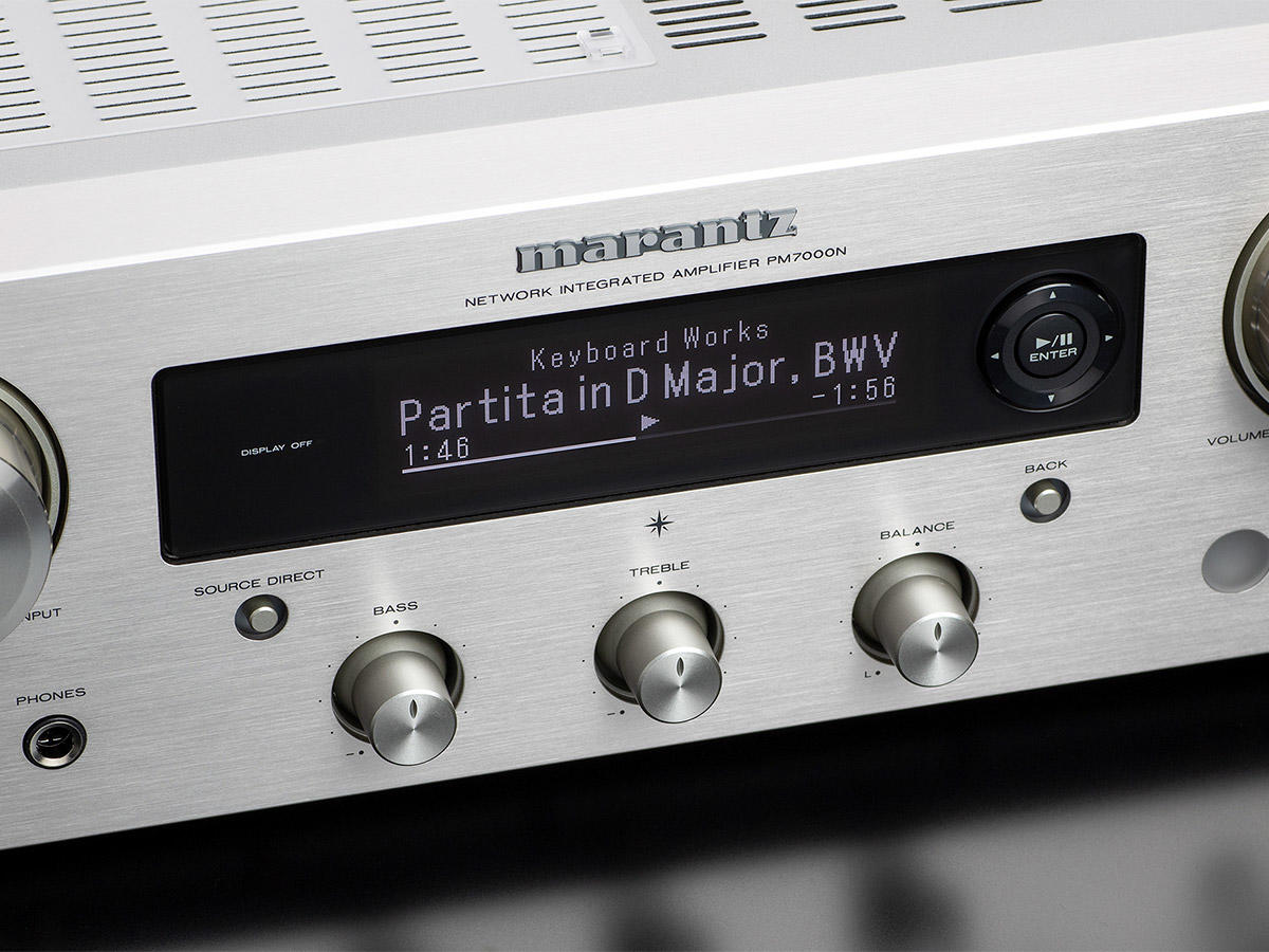Модель Marantz PM7000N сочетает в себе функции полноценного потокового стримера и высококлассного аналогового интегрального усилителя. В аппарате задействована топология схем с обратной связью по току и фирменные дискретные усилительные модули третьего поколения HDAM SA3. Такая конструкция позволяет минимизировать уровень шумов, увеличить скорость нарастания выходного сигнала, повысить динамический диапазон и значительно расширить диапазон частот, обеспечивая превосходное качество звучания при прослушивании как обычных стереозаписей, так и Hi-Res-аудиоформатов. В итоге, согласно информации производителя, обеспечивается более динамичный, точный и детальный саунд. В тщательно проработанном сильноточном блоке питания Marantz PM7000N установлен экранированный тороидальный трансформатор и пара высокоемкостных конденсаторов (каждый по 15000 мкФ). При этом обеспечивается мощность в 60 Вт при нагрузке в 8 Ом. Цепи модели оснащены качественными аудиофильскими комплектующими, а для охлаждения применяются радиаторы, изготовленные из алюминия. Благодаря поддержке беспроводной многофункциональной экосистемы HEOS перед усилителем открываются большие возможности в плане доступа к таким потоковым сервисам, как Spotify (Free или Premium), Amazon Music HD, Deezer, Tidal и пр. Данный аппарат можно интегрировать в беспроводную мультирум-инсталляцию, построенную на базе HEOS-устройств. Для управления Marantz PM7000N предусмотрены пульт и приложение. Командовать «интегральником» также можно посредством голосовых помощников Google Assistant, Amazon Alexa, или Apple Siri. Фронтальную панель усилителя украшает трехстрочный OLED-дисплей. Поддерживается Apple AirPlay 2, двухдиапазонный Wi-Fi и Bluetooth. Доступ к аудиобиблиотекам, хранящимся на PC, Mac или NAS-серверах, осуществляется через WLAN или с помощью LAN-порта. По локальной сети и при использовании встроенного в тыльную панель корпуса USB-порта поддерживается воспроизведение форматов ALAC, FLAC, WAV до 24 бит/192 кГц и DSD до 5,6 МГц. На борту имеется MM-фонокорректор, входная секция которого использует полевые FET-транзисторы. В коммутации следует выделить отключаемый экранированный блок цифровых входов. Существует возможность подключения активного сабвуфера, а для подсоединения акустических систем задействованы две пары фирменных винтовых клемм Marantz SPKT-1+.