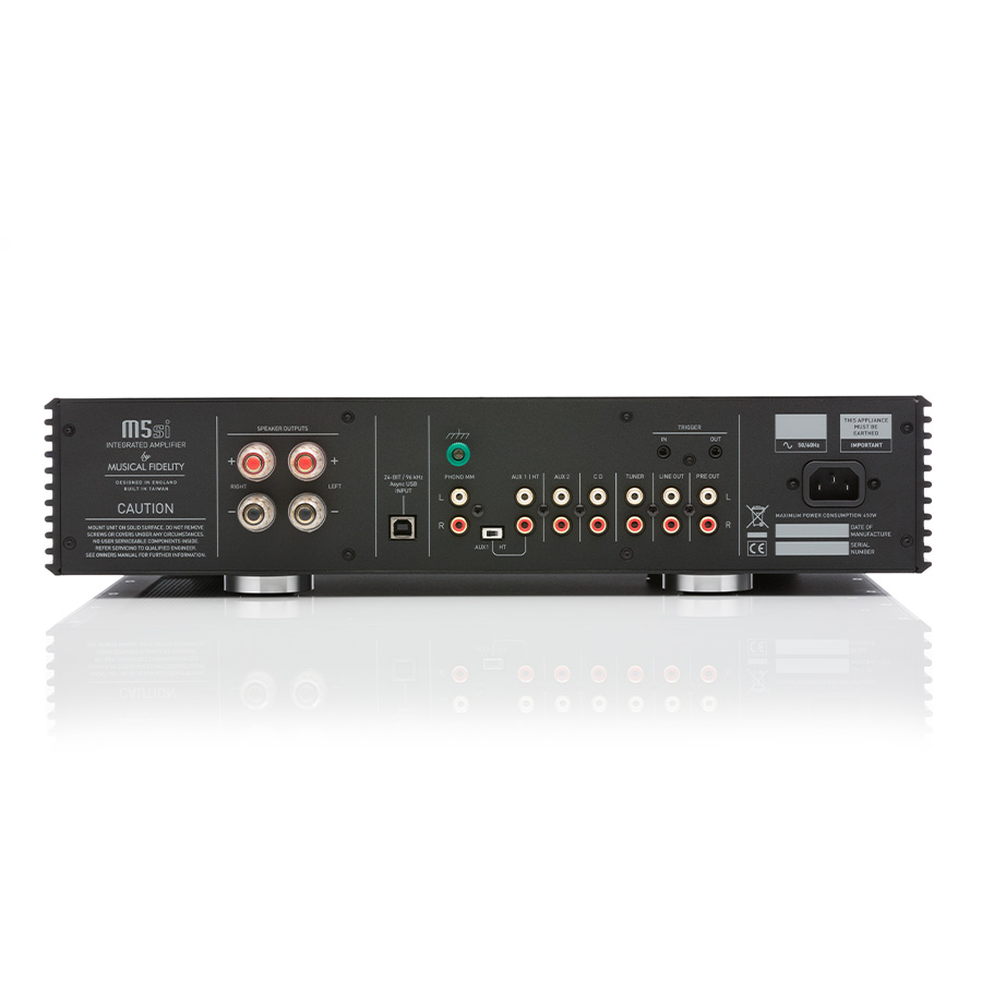 Аппарат оснащен шестью входами для источников сигнала, однако набор их другой, чем у младшей модели серии. Здесь представлены четыре линейных входа (один из них можно перевести в режим HT для подачи сигнала в обход регулятора громкости усилителя), вход для MM-звукоснимателя проигрывателя винила, а также USB-вход для ПК. Это делает Musical Fidelity M5SI отличным выбором для создания качественной Hi-Fi-системы, в которой планируется использовать как аналоговые, так и цифровые источники. В модели имеются фиксированный и регулируемый выходы, сигнал с которых можно подать на различные внешние устройства. Устройство комплектуется дистанционным управлением.