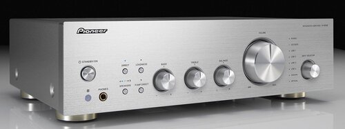 Интегральный усилитель Pioneer A-40AE станет отличным выбором для меломанов, которые бы хотели приобрести универсальный современный аппарат для своих стереосистем. Усилитель выполнен в надежном металлическом корпусе с алюминиевой передней панелью, на которой расположены все необходимые органы управления. Все рукоятки выполнены из алюминия и имеют приятный рабочий ход, а их расположение хорошо продумано для удобного и интуитивно понятного пользования усилителем. Шасси усилителя выполнено таким образом, чтобы устранить любые резонансы, в том числе и возможность возникновения внутренних стоячих волн. Pioneer A-40AE выполнен по фирменной схемотехнике Direct Energy, которая обеспечивает передачу энергии на колонки практически без потерь. В результате полностью используется ресурс блока питания и усилитель способен справляться даже со сложными акустическими системами. В сетевом трансформаторе блока питания Pioneer A-40AE используются раздельные обмотки для схем оконечного и предварительного усиления, а также управляющей электроники. Для полного устранения помех схема заземления в усилителе была оптимизирована для эффективного гашения любых помех. Аппарат оснащен пятью линейными входами, входом с MM-фонокорректора, а также цифровыми оптическим и коаксиальным входами. Также имеются линейный выход и прямой вход для усилителя мощности. Встроенный ЦАП в усилителе реализован на микросхеме Wolfson и имеет параметры 24 бит / 192 кГц. Таким образом, Pioneer A-40AE подходит для воспроизведения аудио в формате High Resolution. К усилителю можно подключить две пары акустических систем, например, при желании озвучить еще одно помещение, или одну пару колонок по схеме Bi-wiring. Также в Pioneer A-40AE предусмотрен выход на наушники, который позволит комфортно прослушивать музыку в позднее время. Усилитель выполнен с использованием отборных компонентов, в том числе конденсаторов ELNA, изготовленных на заказ. Все схемы аппарата были оптимизированы для сокращения путей передачи сигнала, а печатные платы оконечных усилителей рассчитаны на повышенный выходной ток.
