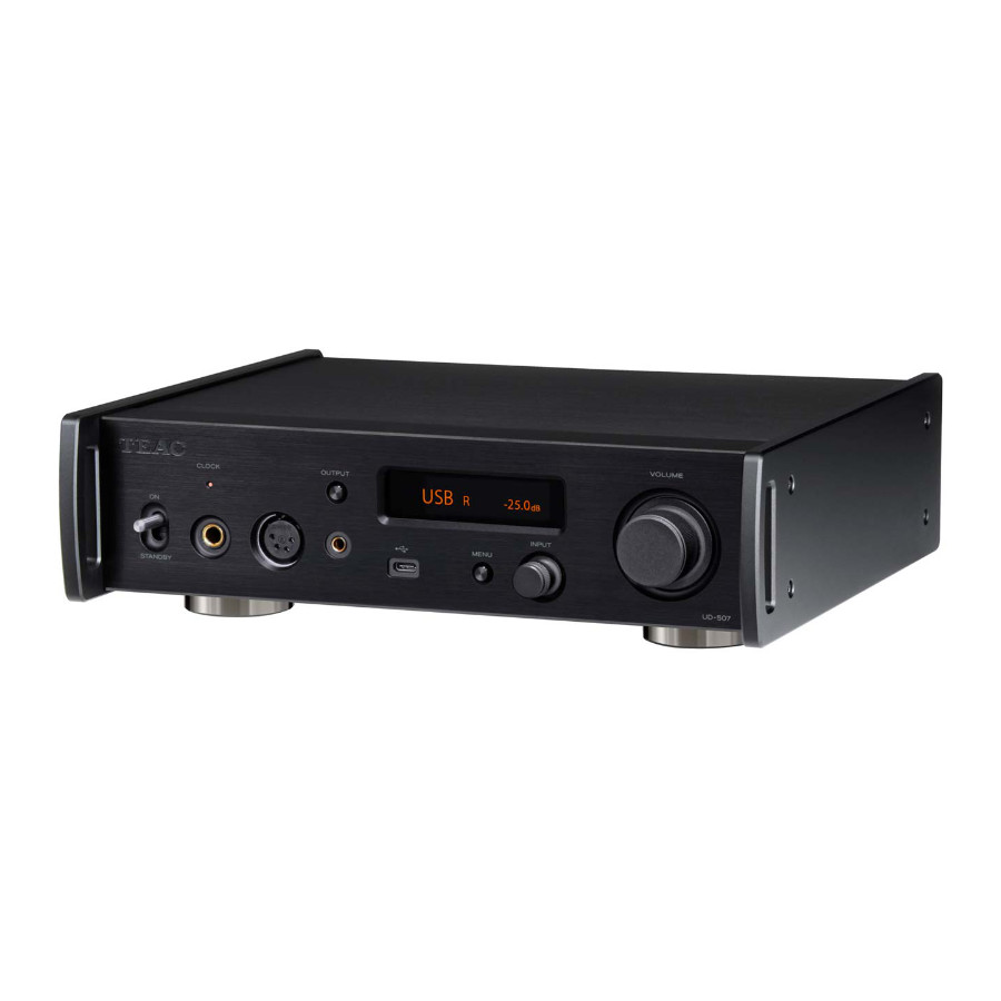TEAC UD-507 - ЦАП со встроенным аналоговым усилителем и предусилителем для наушников. В UD-507 встроены двойные USB-порты (B и C), два оптических и два коаксиальных входа. Поддержка воспроизведения файлов формата PCM достигает 384 кГц, а DSD – до 22,5 МГц. Также в арсенале устройства есть Bluetooth с кодеками LDAC и LHDC. К аналоговым интерфейсам относятся входы и выходы XLR и RCA, а также балансные и небалансные гнезда для наушников. Вдобавок, UD-507 снабжен передовыми функциями работы тактового генератора, апсемплинга и разнообразными режимами работы ЦАПа.