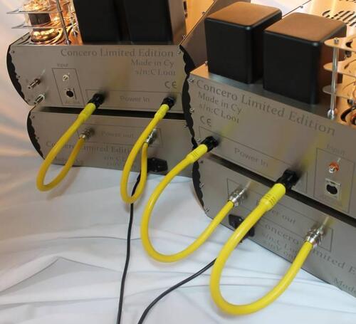 Усилители-моноблоки Aries Cerat Concero 65 Limited Edition с выносными блоками питания. Схема – однотактная с трансформаторной межкаскадной связью. Выходные лампы – мощные прямонакальные лучевые тетроды RCA 813 с максимальной рассеиваемой на аноде мощностью в 125 Вт в триодном включении, по две в параллель. Связь между выходным и предоконечным каскадами трансформаторная. Мощный драйверный каскад выполнен на прямонакальном пентоде RCA 813 в триодном включении. Режимы драйверных и оконечных каскадов могут подстраиваться во время работы. Выходное сопротивление выбирается пользователем в зависимости от импеданса акустических систем: 1,6 Ом (для 8-Омных АС), 0.8 Ом (для 4-Омных АС) или 0,4 Ом (для 2-Омных АС). В блоках питания работают тороидальные трансформаторы общей габаритной мощностью 1500 ВА отдельно для питания анодов выходного и драйверного каскадов, накалов и смещения. В сглаживающих фильтрах присутствуют только полипропиленовые конденсаторы и дроссели весом 11 кг. Накальные напряжения подвергаются трехкратной фильтрации. Массивные выходные трансформаторы обеспечивают высокие линейность и перегрузочную способность, а также широкий частотный диапазон в области низких частот.