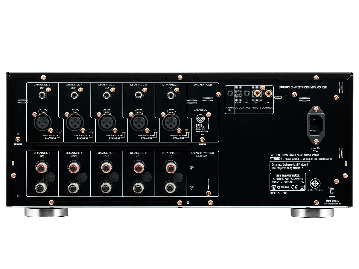 В схемах Marantz MM7055 используются отборные комплектующие аудиофильского класса, прошедшие строгий входной контроль качества на заводе фирмы. Выходные транзисторы установлены на массивных фрезерованных алюминиевых теплоотводах, гарантирующих надежную работу аппарата при высокой нагрузке даже без использования принудительной вентиляции. Высокий выходной ток усилителя обеспечивает совместимость с самыми сложными акустическими системами, и способность Marantz MM7055 без ограничений передавать широчайший динамический диапазон современных звуковых дорожек кинофильмов в форматах High Definition. На входах каждого канала установлены специальные буферные каскады, улучшающие согласование усилителя с любыми предусилителями и AV-процессорами, а также соединительными кабелями. Усилитель Marantz MM7055 оснащен балансными и небалансными входами, имеет разъемы для внешней системы дистанционного управления, вход для внешнего ИК-датчика, и вход/выход 12-вольтового триггера. В круглом окошке на передней панели усилителя расположены индикаторы включения, а также срабатывания системы защиты. Она отличается высоким быстродействием, и предотвращает выход из строя усилителя и подключенной к нему акустики при возникновении любых нештатных ситуаций.
