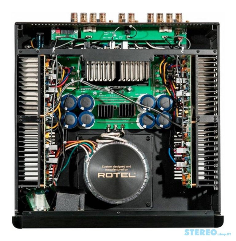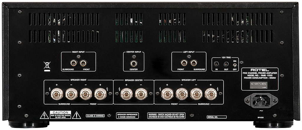 Многоканальный усилитель мощности Rotel RMB-1555 можно использовать как в составе высококлассной системы домашнего кинотеатра, так и в мультирум. Аппарат имеет пять усилителей, развивающих по 120 Вт на нагрузке 8 Ом. Выходные каскады выполнены на высокотоковых транзисторах, что обеспечивает хорошую совместимость Rotel RMB-1555 практически с любыми акустическими системами. Усилители всех каналов выполнены на одинаковых печатных платах с увеличенным сечением проводников и сокращенной длиной цепей передачи аудиосигнала. Выходные транзисторы установлены на теплоотводах с большой эффективной площадью. В сочетании с комбинированным режимом работы усилителей (класс A/B) это обеспечивает надежную работу усилителя даже при высокой громкости звука. Все компоненты, которые используются в схеме усилителя, проходят строгий входной контроль качества. Блок питания RMB-1555 выполнен на базе массивного тороидального трансформатора, изготовленным компанией Rotel и имеющим точно выдержанные параметры. Также в фильтре установлены несколько параллельно включенных конденсаторов значительной суммарной емкости. Аппарат оснащен RCA-входами, а также надежными винтовыми клеммами для подключения акустических систем. Управлять включением усилителя можно с помощью триггера, также предусмотрен триггерный выход для подачи команды включения на другие AV-компоненты. Rotel RMB-1555 выполнен в солидном металлическом корпусе большой высоты, что обеспечивает свободную циркуляцию воздуха и отвод тепла от схем. Значительная выходная мощность аппарата предусматривает наличие быстродействующей схемы защиты, срабатывающей в любых нештатных ситуациях. На передней и задней панелях усилителя предусмотрены вентиляционные отверстия, что дополнительно повышает надежность его работы. Массивное антирезонансное стальное шасси снабжено дополнительной пятой опорой для придания большей устойчивости всей конструкции. Rotel RMB-1555 комплектуется съемным электрическим кабелем, который можно при желании заменить на любой другой.