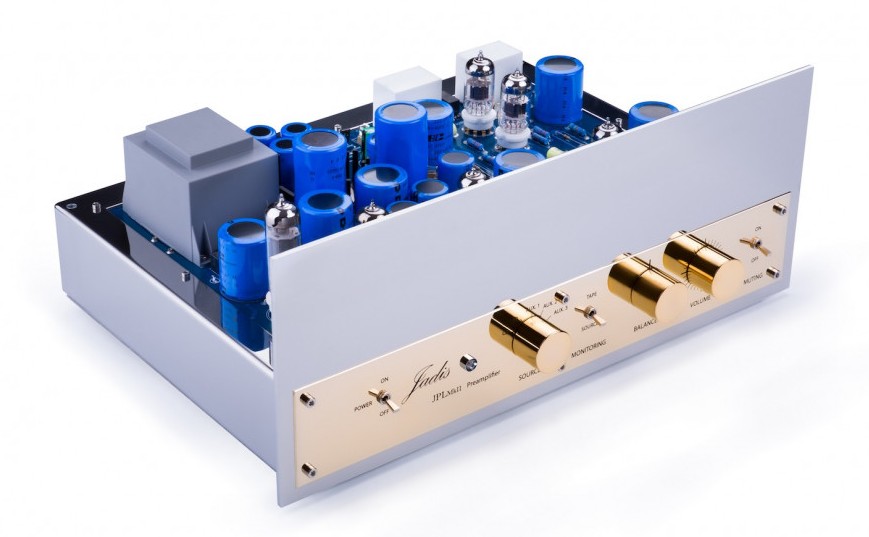 Линейный ламповый предварительный усилитель с ламповым стабилизатором анодного напряжения в блоке питания. Один из входов (CD) – открытый, с гальванической связью с сеткой входного триода 12 AU7 (буферный каскад с единичным усилением). Остальные входы – закрытые (через емкости 1 мкФ), и подают сигнал на двойной триод 12AX7. Вторая такая же лампа используется в схеме выходного катодного повторителя. Предусилитель, помимо основных входов, оснащен также входом и выходом Tape. Трансформаторы (выходные и силовой) разработки и производства Jadis.