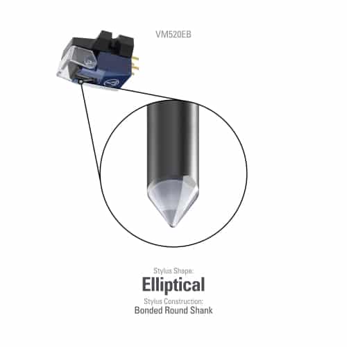 VM520EB оснащена эллиптической алмазной иглой, которая закреплена на кантилевере, выполненном из алюминия. Небольшое пятно контакта иглы обеспечивает хороший показатель трекинга и детализированный звук. Легкий и прочный держатель точно передает движения иглы по звуковой дорожке пластинки на магнитную систему и в то же время защищает ее от паразитных вибраций, которые могут быть вызваны резонансами. Одной из особенностей данной модели является сравнительно высокое выходное напряжение, которое составляет 4,5 мВ на частоте 1 кГц. Это обеспечивает хорошую совместимость с различными фонокорректорами, в том числе начального уровня, а также встроенными в недорогие интегральные усилители и AV-ресиверы. Повышение эффективности работы звукоснимателя VM520EB удалось обеспечить благодаря использованию двух магнитов, каждый из который «работает» на свой стереоканал, а также паратороидальной намотке катушек.