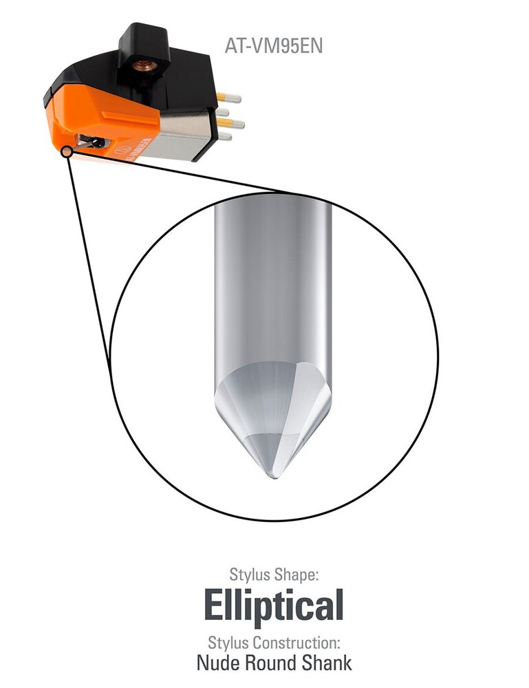 Audio-Technica AT-VM95EN – новый картридж с эллиптической заточкой алмазного кончика иглы (Elliptical Nude). Эллиптическая заточка повышает качество воспроизведения музыкального материала особенно в отношении точности высоких частот и переходных характеристик.