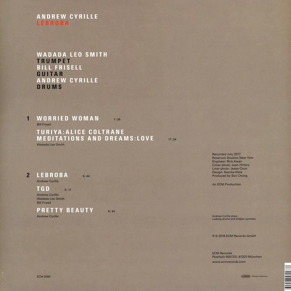 "On his second ECM release, Cyrille again is paired with the endlessly inventive guitarist and fellow melodicist Bill Frisell. Trumpeter Wadada Leo Smith rounds out this remarkably creative and empathetic triumvirate. […] Rather than fronting the proceedings by flaunting his chops, Cyrille underscores ‘Lebroba’ with a combination of grace, zen-like restraint and authority." - Bill Milkowski, Downbeat