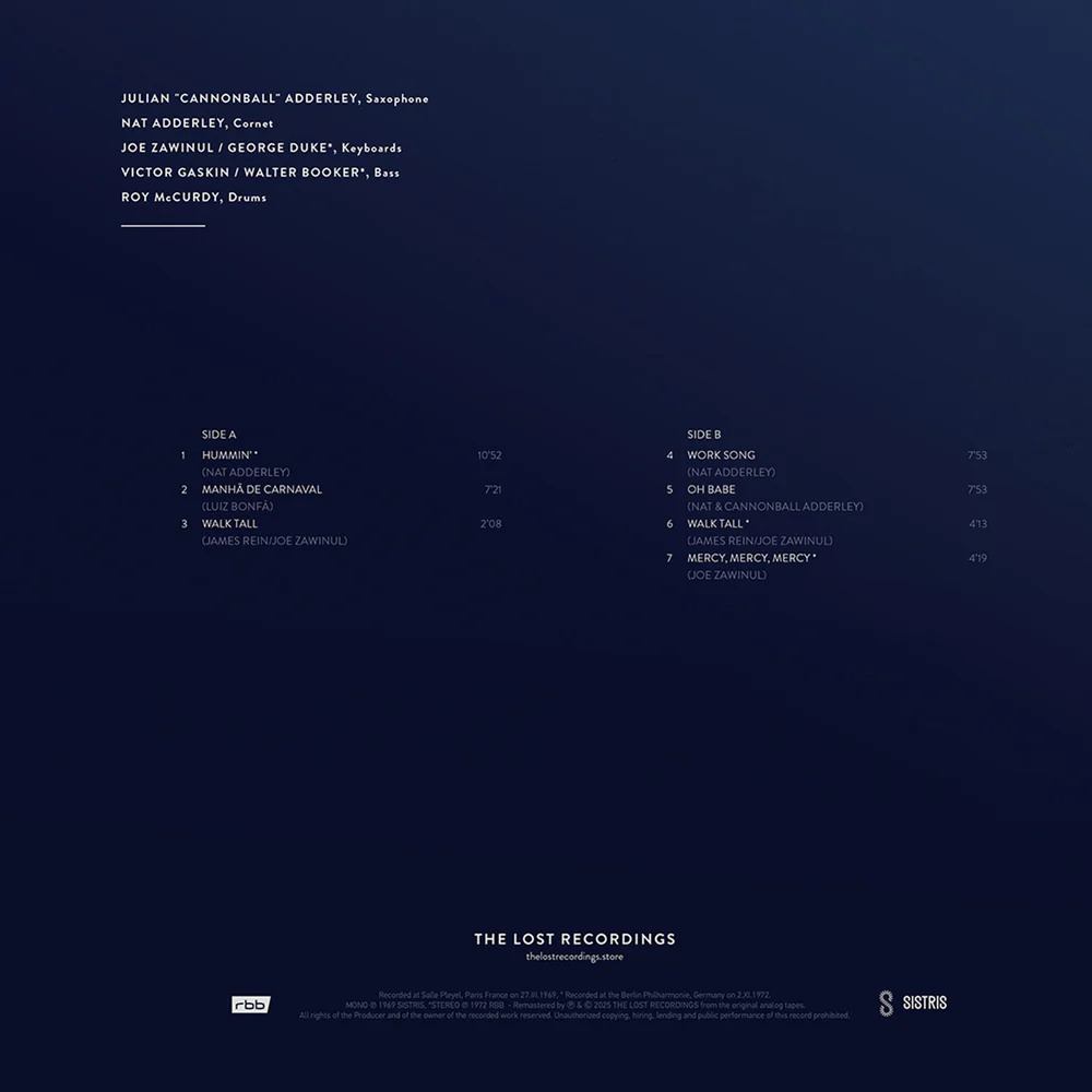 Adderley rose to prominence in 1958 with the historic recording "Somethin' Else" alongside Miles Davis and John Coltrane. But instead of staying in her shadow, he went his own way. In 1960, he moved to Europe with his brother Nat, where many African-American jazz artists found creative freedom beyond the racial conflicts in the United States. Cannonball flourished, unbound by trends or expectations. His stage presence was impressive, his sound powerful and sensual, and his charisma thrilled the audience right away. This album from The Lost Recordings features unreleased recordings from Berlin (1972) and Paris (1969) and shows Adderley at the height of his career. From the pulsating energy of "Hummin" to the delicate depth of "Manhã De Carnaval", each track is a testament to refined artistry. Standout tracks like "Walk Tall" and "Work Song" embody his commitment to dignity and justice, while "Oh Babe" and "Mercy, Mercy, Mercy" combine raw emotion with joyful groove. The funky undertones hint at the future of R&B and confirm Cannonball's role as a visionary.
