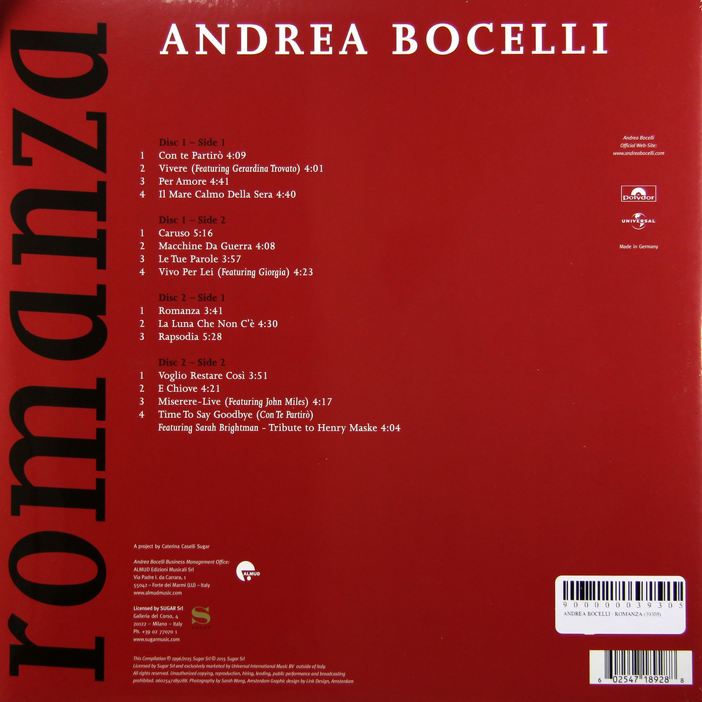 Romanza is the labum that launches his careeer. The 12 songs include "Time to Say Goodbye." Bocelli's spine tingling #1 single with Sarah Brightman. A 180g 2LP set in a gatefold package with printed inner sleeves.
