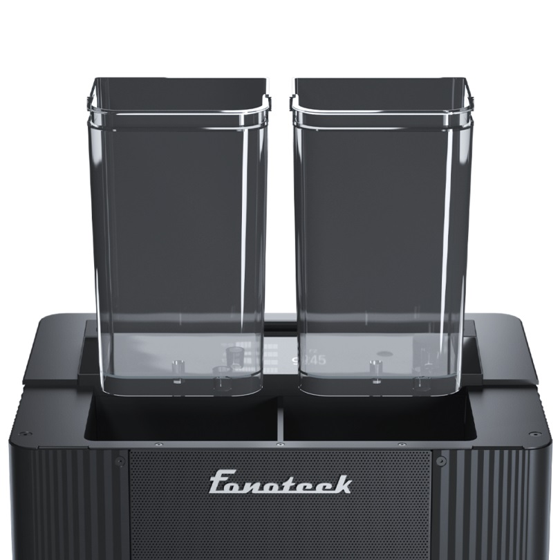 Degritter Fonoteek позволяет выполнять циклы ультразвуковой очистки бесконечно долго благодаря мощной системе водяного охлаждения, которая поддерживает температуру воды прохладной и безопасной. В комплект машины входят два съемных резервуара для воды объемом 3 л. Левый резервуар предназначен для циклов очистки, а правый - для ополаскивания. При желании в левый резервуар можно добавить жидкость для очистки от песка. Для поддержания чистоты воды для ополаскивания мы используем три больших фильтра с активированным углем. Они удаляют остатки чистящей жидкости из бачка для ополаскивания.