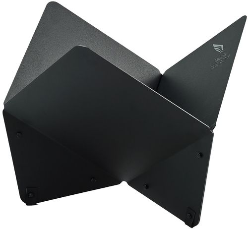 Подставка изготовлена из металла и имеет форму открытого куба, в котором осталось три стороны из шести. Пластинки в Analog Renaissance TARS можно размещать вдоль любой из сторон, всего же подставка вмещает около 30 дисков. Форма подставки хорошо продумана, и TARS не опрокинется даже в случае полной загрузки. На одной из сторон подставки вырезан логотип компании-изготовителя.