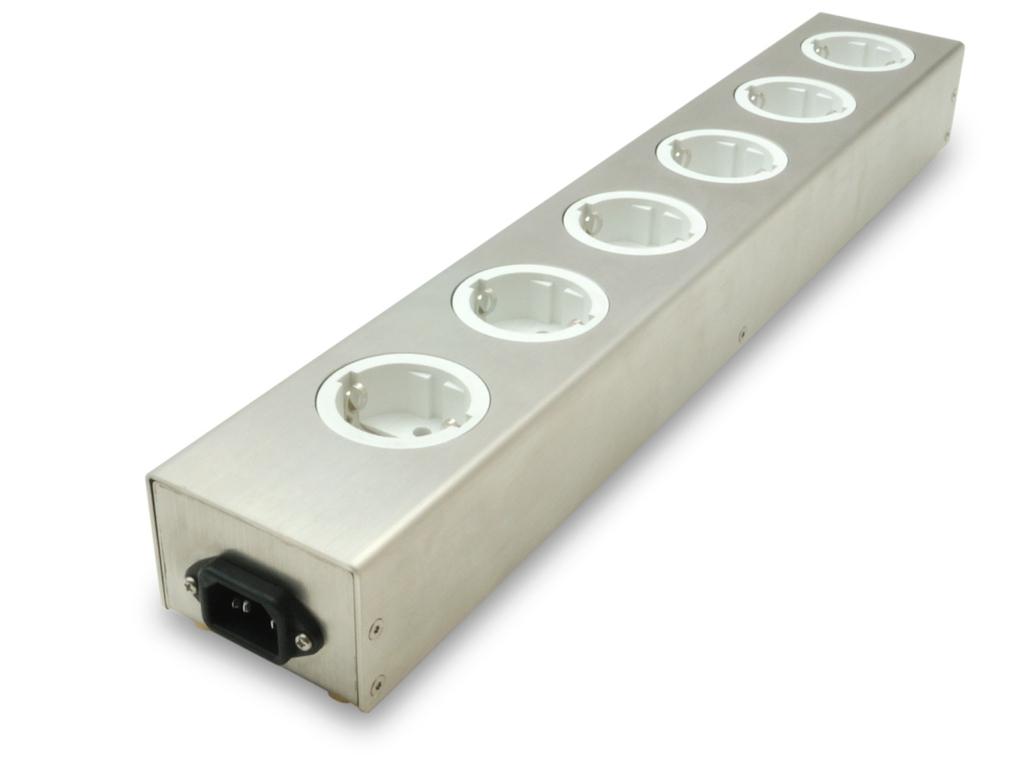 Сетевой распределитель MTS-6e имеет простой внешний вид с линейным, как у недорогих моделей, размещением электрических розеток. Но при его создании специалисты компании Oyaide использовали многочисленные ноу-хау, накопленные ими за многие годы создания аналогичных устройств. Распределитель имеет съемный сетевой кабель, что позволяет при желании заменить его на аналогичный, более высокого класса. Распределитель оснащен фирменными электрическими розетками с двойными пружинными контактами и шириной контактной поверхности в 9 мм, обеспечивающими исключительно плотную и надежную фиксацию штепселя. Это гарантирует надежный электрический контакт практически в любых условиях эксплуатации, в том числе и при значительных вибрациях корпуса распределителя. Контакты в розетках изготовлены из латуни, и покрыты слоем серебра (1,5 микрон) и родия (0,3 микрона). Для внутреннего демпфирования корпуса использован синтетический материал VEM 313 (Visco Elastic Material), эффективно подавляющий любые механический вибрации. Корпус Oyaide MTS-6e изготовлен из нержавеющей стали с немагнитным покрытием. Таким образом, сетевой распределитель имеет надежную защиту от внешних электромагнитных помех. Все остальные элементы конструкции устройства, включая крепежные винты, также выполнены из немагнитных материалов. Внутренний монтаж распределителя MTS-6e производится кабелем из бескислородной меди сечением 2 мм, с помощью высококачественного припоя SS-47, точно такого же, который используется при создании аудиотехники. Разработчики компании Oyaide предусмотрели для сетевого распределителя MTS-6e даже такую мелочь, как его механическую развязку от пола. Устройство устанавливается на латунные шипы (как Hi-Fi-акустика), причем их может быть как четыре, так и три – если, например, пол не слишком ровный, то трехточечная опора не даст распределителю раскачиваться. Oyaide MTS-6e рассчитан на подключение нагрузки суммарной мощностью до 2500 Вт, что позволит использовать его в составе довольно сложных AV-систем.