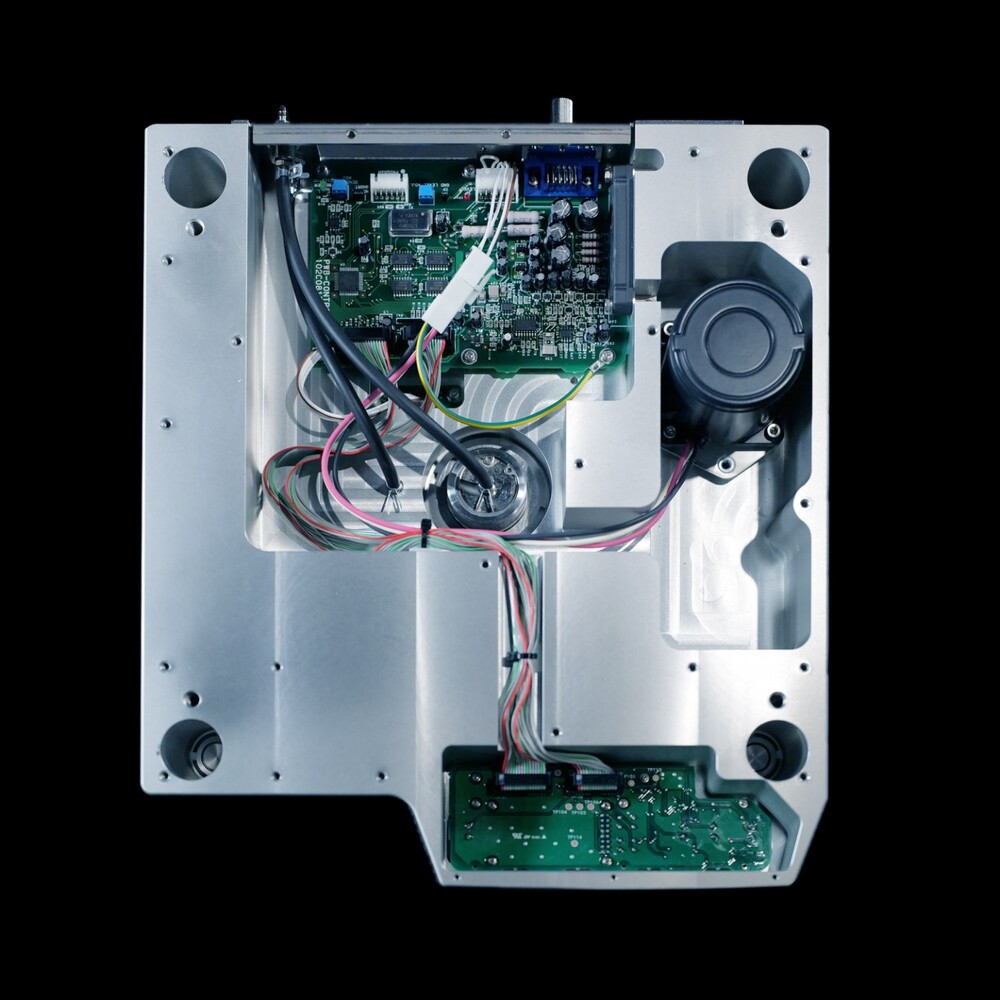 It employs a sub-platter system consisting of an inner-sub and an outer platter both precision machined from solid aluminum alloy A5056. With a total weight of 7kg it gives sufficient inertia for smooth and stable rotation. The outer platter surface is black anodized with a gloss hairline finish, and matches well with the silver aluminum plinth. It features a tapered spindle to absorb any swaying of an off center LP and a very thin pad of anti-vibration material applied on top to protect records.