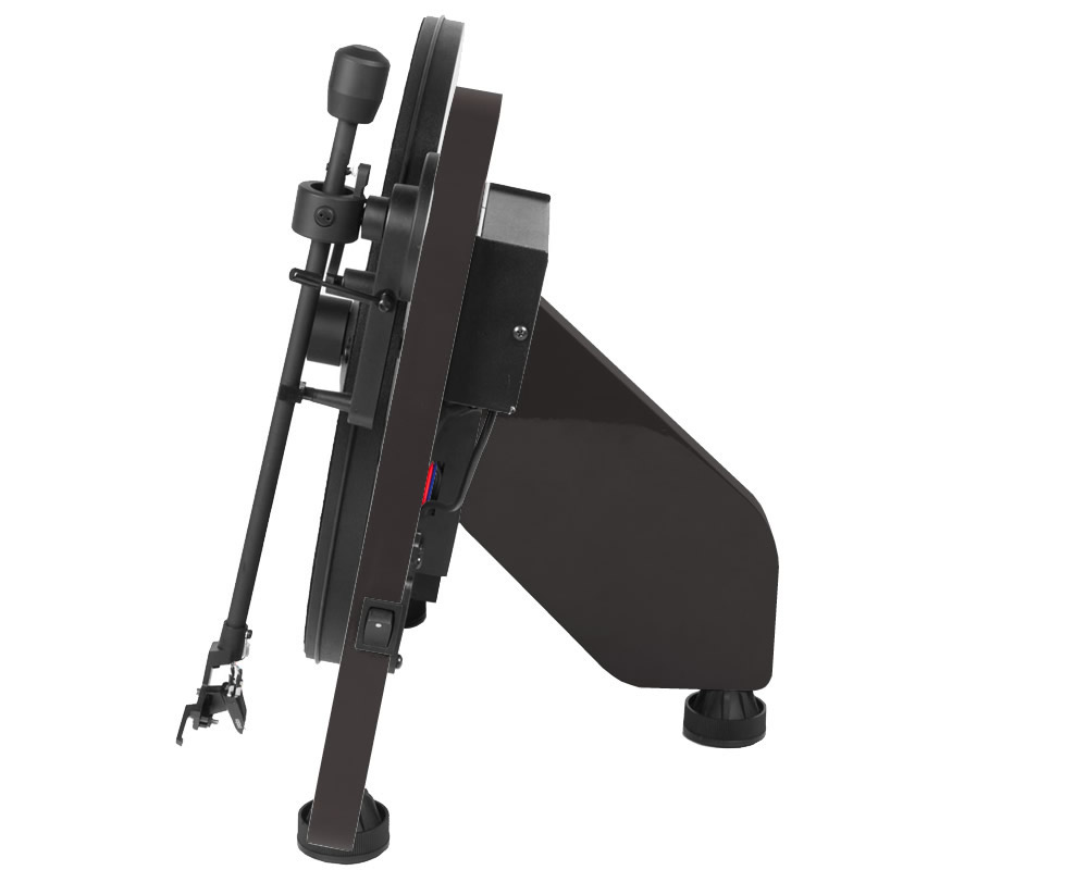 Проигрыватель винила Pro-Ject VT-E BT R сохранил главную особенность базовой версии, работу в вертикальном положении, благодаря чему остается уникальным предложением на Hi-Fi-рынке. Аппарат можно установить на столе или полке, с помощью специальной задней опоры, или просто повесить на стену (соответствующие кронштейны также прилагаются). Нормальная работа устройства достигается специальной настройкой противоскатывающая силы с помощью пружинки, поэтому качество звучания VT-E BT R не отличается от обычных «горизонтальных» моделей данного класса. Пластинка фиксируется на опорном диске с помощью винтового прижиме, который не только не дает ей упасть, но и улучшает гашение паразитных вибраций. Алюминиевый тонарм длиной 8,6 дюйма оснащен стандартным шеллом, на который при желании можно установить (вместо штатного картриджа Ortofon OM5е) другой звукосниматель. Предусмотрено две скорости вращения диска, переключение которых производится с помощью перевода приводного ремня с одного ролика на шкиве двигателя на другой.