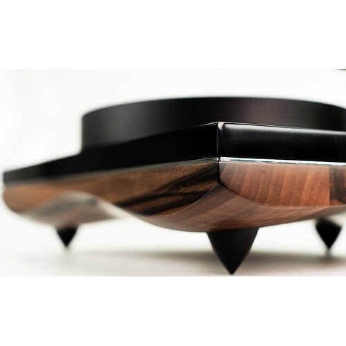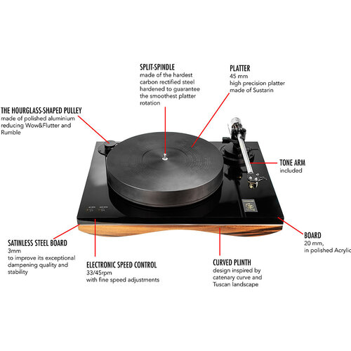Конструкция изогнутого цоколя толщиной 60 мм основана на цепной кривой - высокоэффективной концепции, разработанной колоннами эпохи Возрождения, Микеланджело Буонарроти и Галилео Галилеем. Корпус, изготовленный из древесины итальянского ореха, отличается высоким качеством этого благородного материала: исключительной эластичностью, прочностью и высокой плотностью. Конструкция тройного цоколя усилена прочной доской толщиной 20 мм из полированного акрила и листом толщиной 3 мм из нержавеющей стали в 18-ти точках, что повышает его исключительное демпфирующее качество и стабильность. Деревянное основание опирается на три регулируемые шипы элегантной формы, изготовленные из анодированного алюминия. Высокоточная пластина толщиной 45 мм, изготовленная из высокоплотного POM, имеет ременной привод и работает от запатентованной системы управления, разработанной на четырехъядерном микроконтроллере, дополненном аудиопреобразователем. Регулятор мощности перестраивает волну переменного тока таким образом, чтобы она идеально приводила в действие синхронный двигатель напряжением 12 В, устраняя вибрацию и повышая крутящий момент, обеспечивая максимальную динамику и мельчайшие детали. Новый идеально отполированный шкив мотора в форме песочных часов также работает на уменьшение детонации. Блок питания электронным образом управляет режимами 33 и 45 об/мин, а также точной регулировкой скорости, сохраняя все настройки в памяти. Конструкция подшипника/шпинделя Mediterraneo длиной 80 мм изготовлена из прочнейшей ректифицированной углеродистой стали для достижения идеальной текучести при работе. Система подшипников изготовлена из бронзы, что гарантирует максимально плавное вращение пластины.