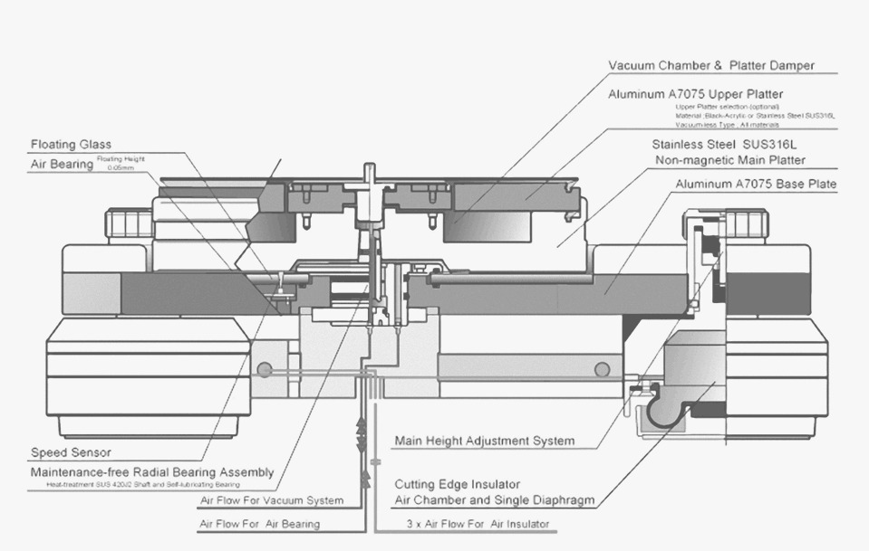 The turntable platter is custom designed to complement the heavyweight chassis. As stated previously the platter of this system is equipped with a vacuum disc suction mechanism, unlike a simple solid disk it is consisting of a combined main platter with an upper platter having an air chamber with a capacity of 1.1 liter internally. The main platter is made of elaborately forged non-magnetic stainless steel SUS316L in luxury with its outside diameter of 310mm, a height of 54mm and a weight of 19Kg having a 40mm thick perimeter, which generates a large inertia force when rotating.