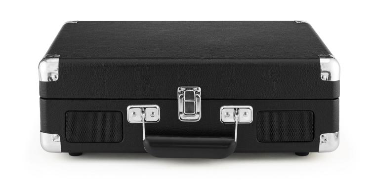 Виниловый проигрыватель Crosley Cruiser Plus в классической отделке из чёрной кожи с красным бархатом внутри, станет прекрасным аксессуаром в вашей комнате.