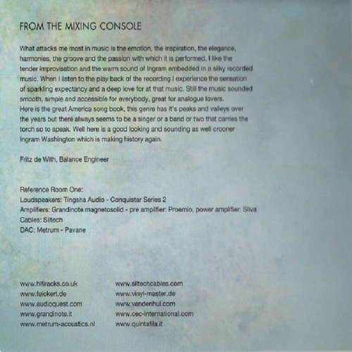 Ingram Washington's distinctive baritone voice exhibits the smoothness of Billy Eckstine while his vocal styling shows a touch of Nat King Cole and Frank Sinatra. It is no surprise that Ingram has such a large following in Western Europe. The album includes some dreamy romantic ballads like the hauntingly beautiful Rogers and Hart composition "My Funny Valentine" and the Nat King Cole classic "Unforgettable".