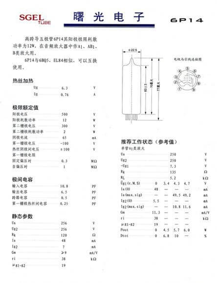 Основные технические характеристики: Ток накала — 700-820 мА; Ток анода —40-56 мА; Выходная мощность — 3 Вт; Напряжение накала — 6,3В; Напряжение анода — 256 В. Сопротивление в цепи сетки — 0,51 МОм.